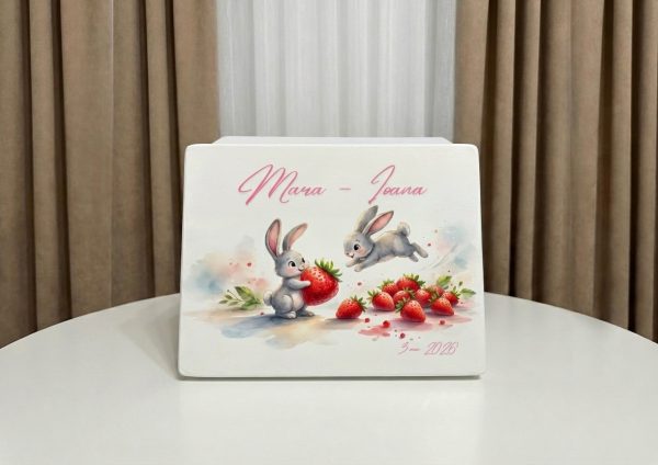 Aceasta cutie de lemn personalizata cu iepurasi si capsuni este unul dintre cele mai vesele si proaspete modele pentru fetite din colectia Lovia. Ilustratia acuarela luminoasa, cu doi iepurasi gri jucandu-se printre capsuni rosii si frunze verzi pe fond alb curat, aduce energie, bucurie si o prospetime vizuala rara. Personalizata cu numele fetitei si data botezului in caligrafie roz, devine o amintire de familie pe care o pastrezi pentru totdeauna.