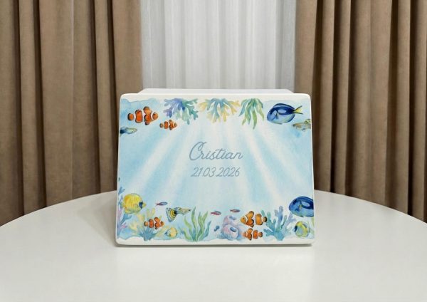 Aceasta cutie de lemn personalizata cu lumea acvariului este unul dintre cele mai spectaculoase modele pentru baieti din colectia Lovia. Ilustratia acuarela cu pesti colorati, corali, alge si raze de lumina filtrate prin apa albastra aduce pe capacul cutiei o intreaga lume subacvatica plina de culoare si viata. Personalizata cu numele baiatului si data botezului, devine o amintire de familie pe care o pastrezi o viata.