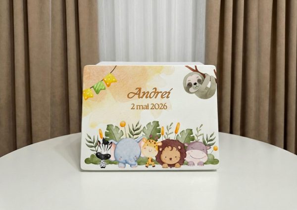 Daca vrei o cutie de amintiri personalizata pentru botez cu o tematica plina de viata si energie, modelul Safari Animale Jungla este alegerea care nu dezamageste niciodata. Sase animale adorabile adunate in iarba tropicala, un lenes atarnat jucaus intr-un colt si o ghirlanda festiva deasupra, totul in acuarela calda si luminoasa, creeaza o scena completa, fotografiabila si memorabila.