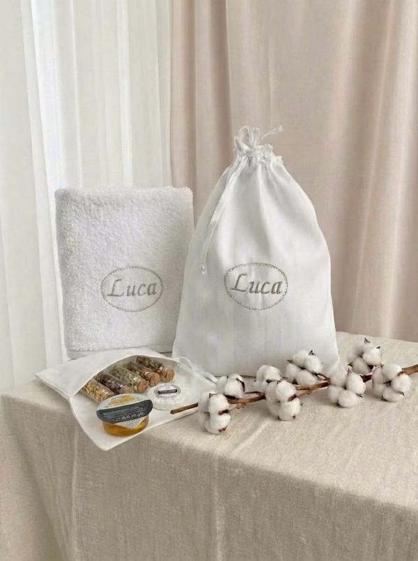Personalizarea include brodarea numelui copilului (si data la cerere) pe saculet si prosop. Saculetul pentru mirodenii contine textul: Prima baita cu nasii.