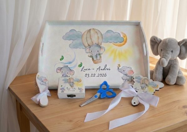 Tăvița moț pentru băieți cu elefantel și balon cu aer cald este una dintre cele mai căutate opțiuni pentru ceremonia de un an. Designul acuarelă în tonuri pastelate, cu elefantelul jucăuș plutind printre nori și luna, transmite magie, bucurie și inocența primului an de viață. Personalizata cu numele băiețelului și data evenimentului, devine o amintire de neprețuit.