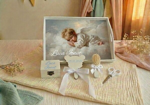 Această tăviță pentru ceremonia de un an are un design delicat și profund emoțional, potrivit atât pentru băieți, cât și pentru fete. Ilustrația cu îngerul adormit transmite liniște, protecție și puritate, fiind o alegere inspirată pentru părinții care își doresc un set elegant, cu simbolistică discretă și atemporală.